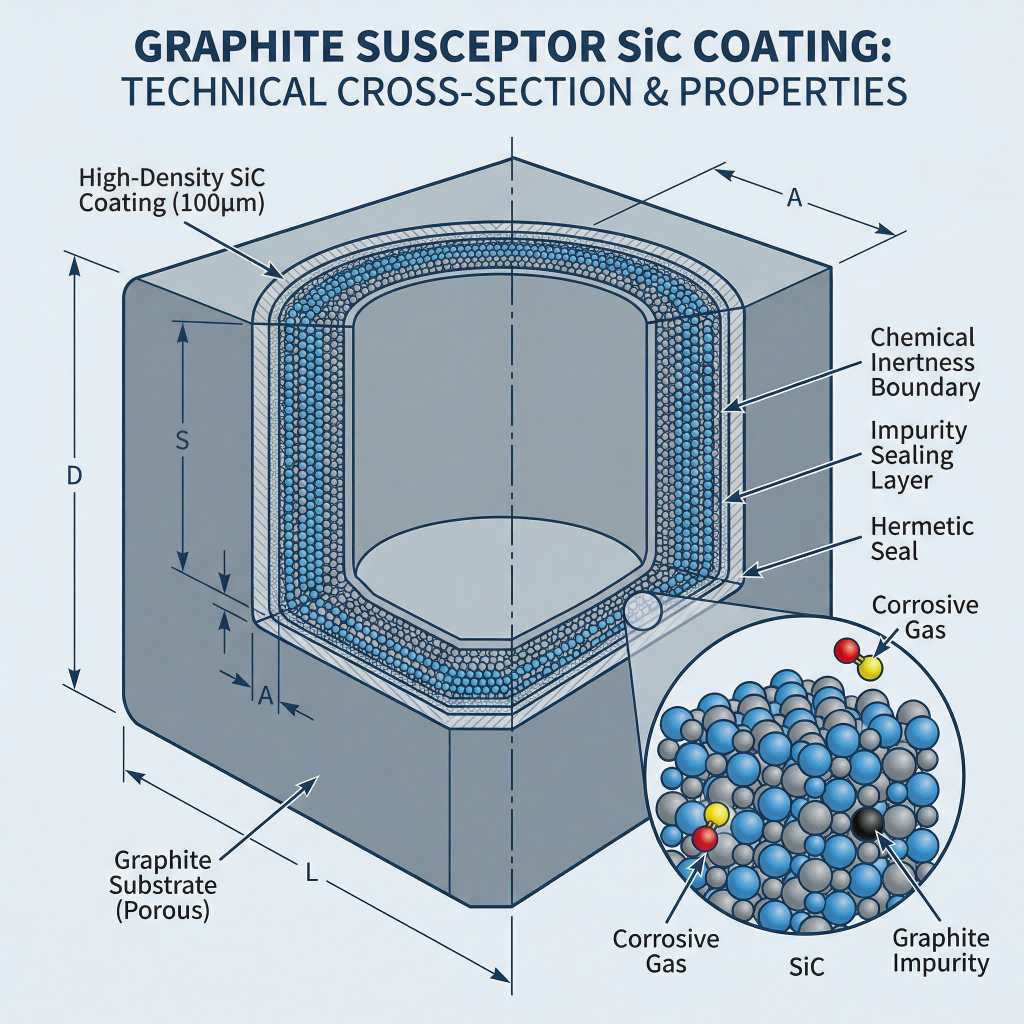 MOCVD- tai epitaksiaalisissa prosesseissa grafiittisuskeptorit vaativat tyypillisesti korkean suorituskyvyn pinnoitteita. Esimerkiksi piikarbidipinnoitteen (SiC) tiheys määrittää suoraan sen kyvyn tiivistää epäpuhtaudet alustan sisällä.